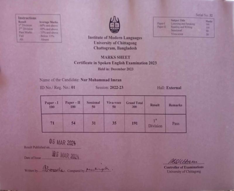 Institute of Modern Languages (IML), Certificate in English.